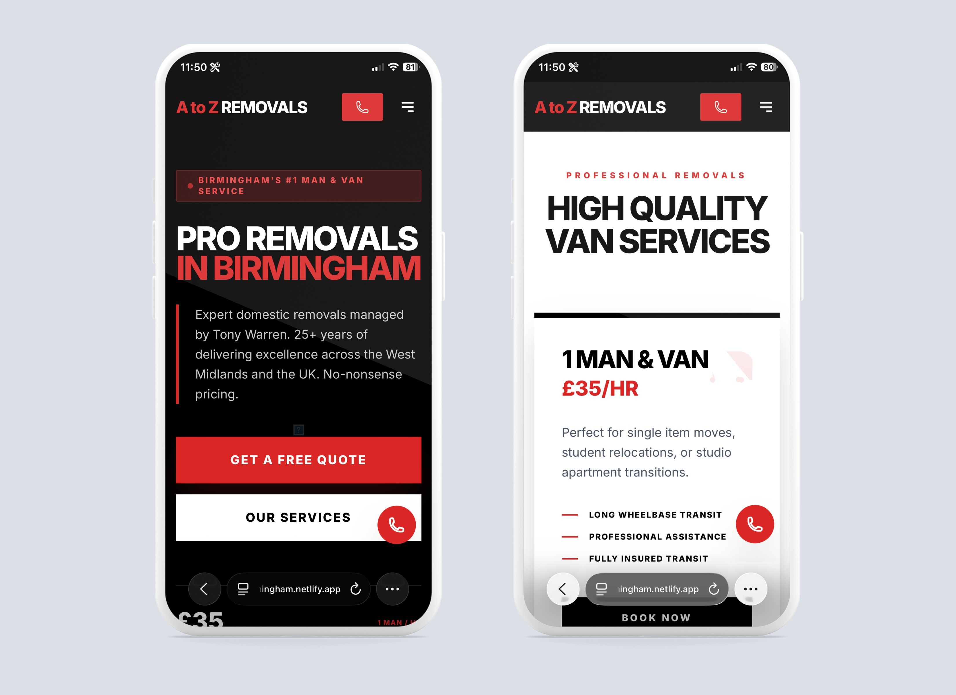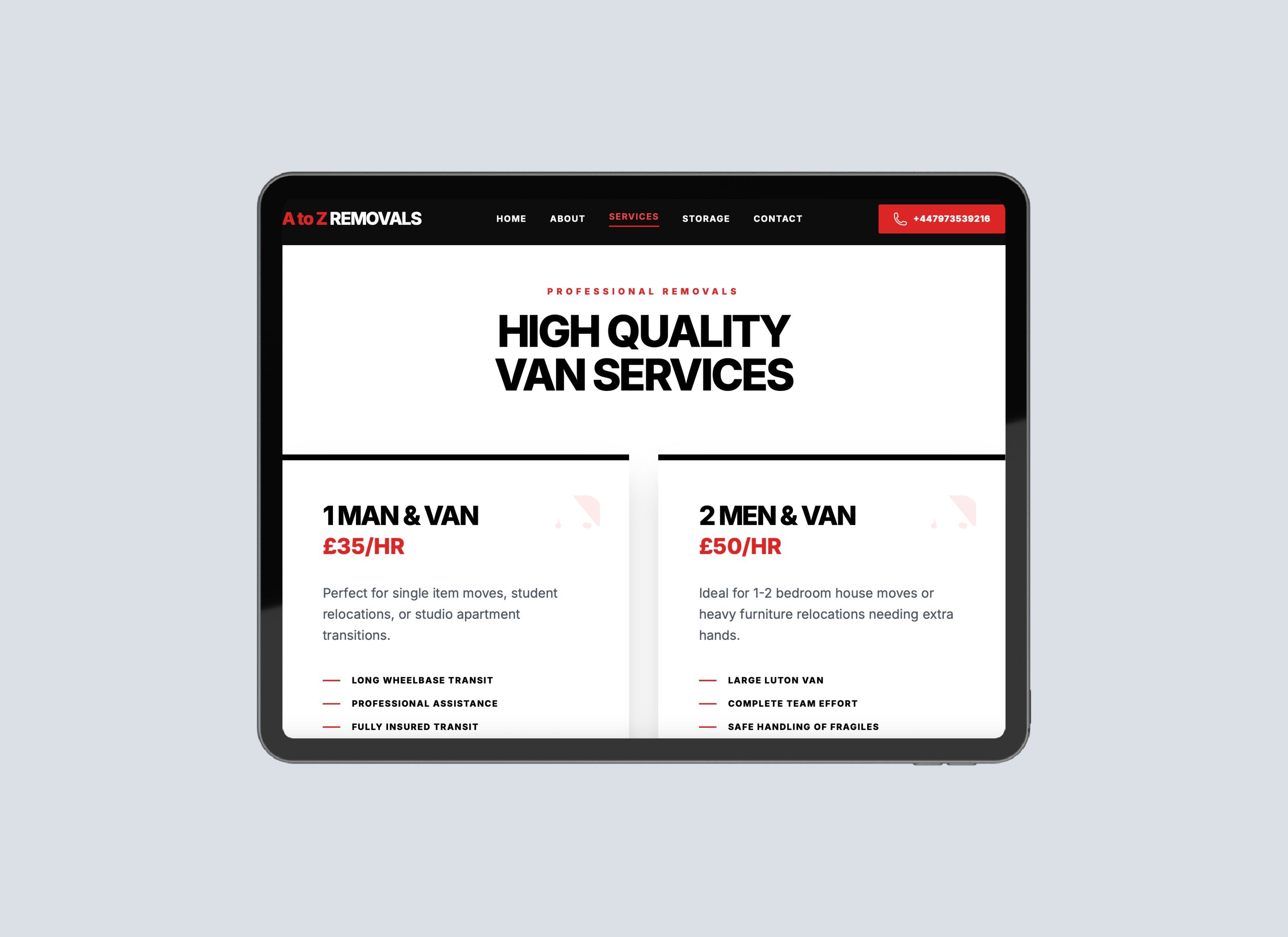 This project involved the design and build of a professional website for A to Z Removals, a Birmingham-based man and van service with over 25 years of experience operating across the West Midlands and the UK. The aim was to create a clear, trustworthy online presence that reflected the business’s longevity while making it easy for customers to understand services, pricing, and how to get in touch. The website was structured to appeal to customers looking for reliable, no-nonsense removals support. Clear pricing, simple service tiers, and prominent contact details were prioritised throughout the design to reduce friction and encourage direct enquiries. The site also highlights trust signals such as years of experience, consistent positive feedback, and long-standing partnerships.